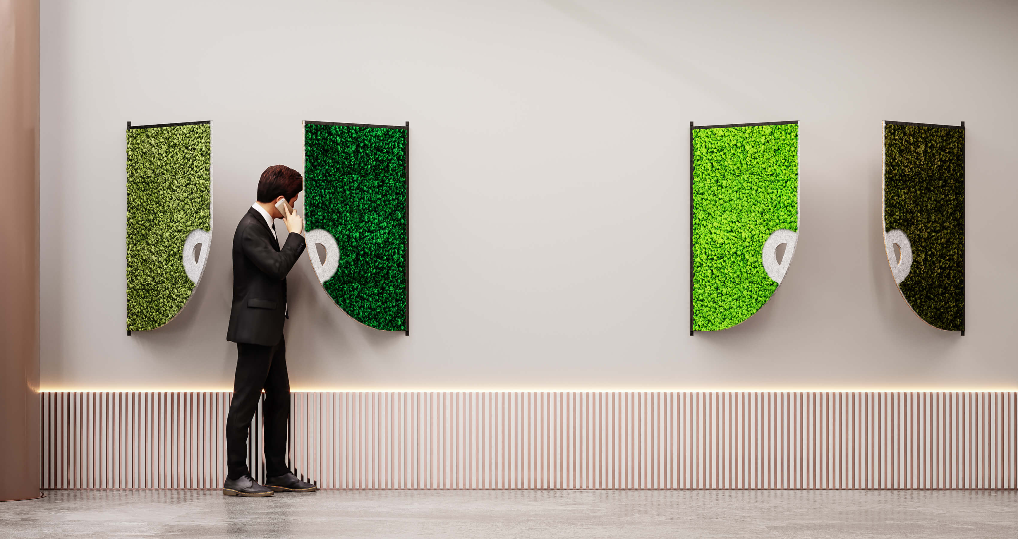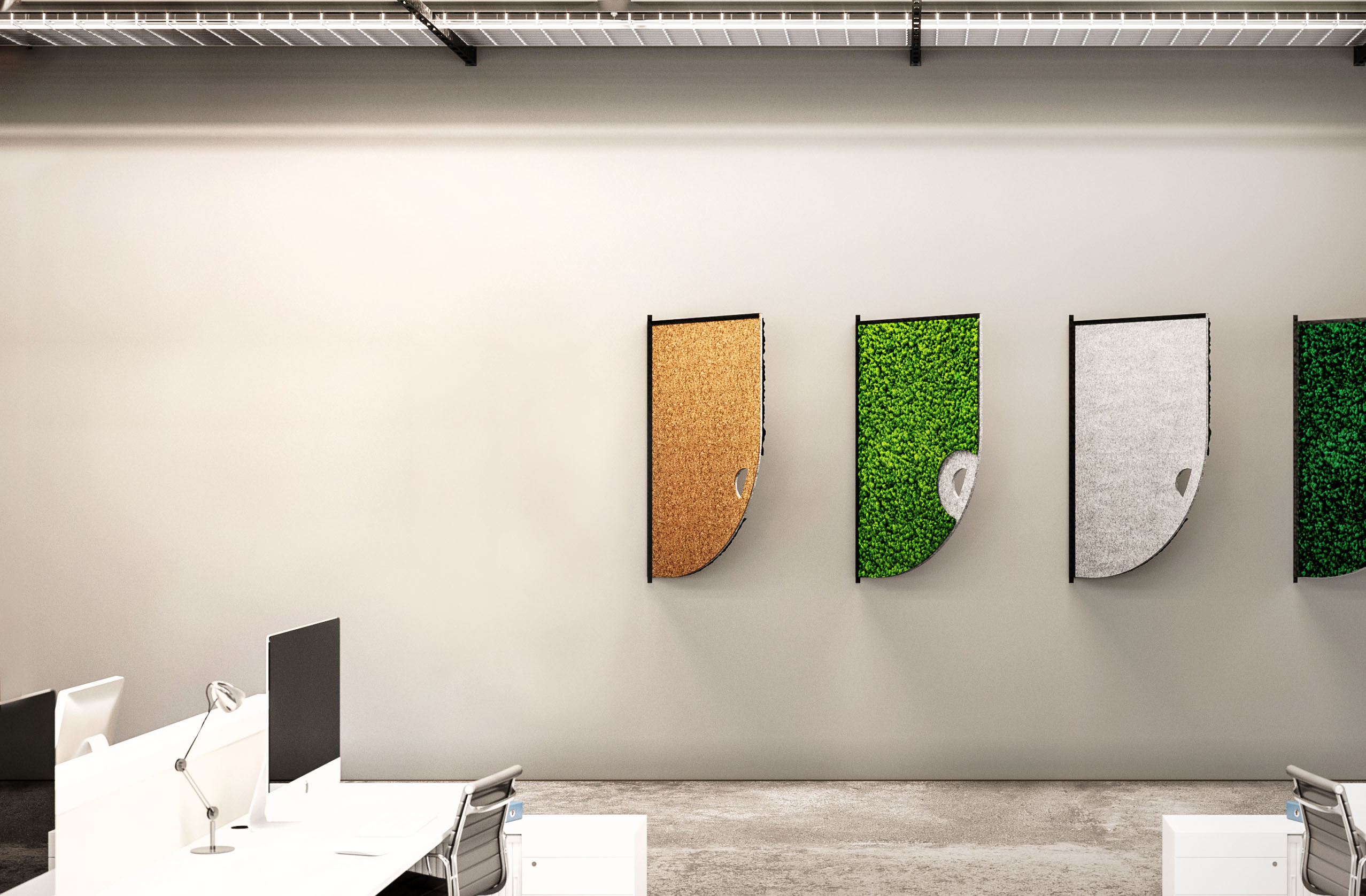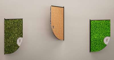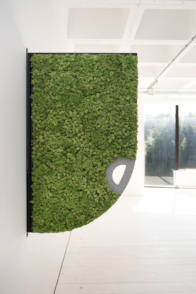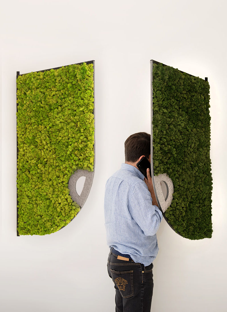 The Comma acoustic screens are available in a variety of different moss tones and can be mixed and matched to suit any interior design scheme.