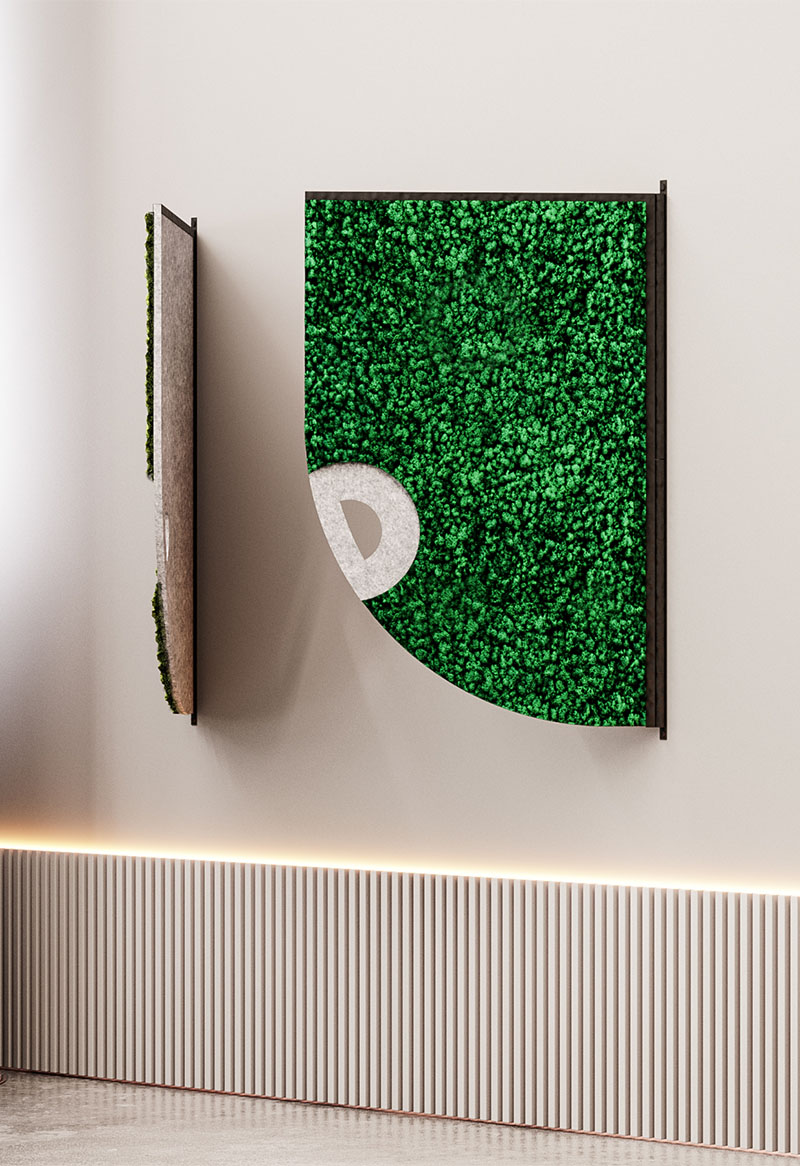 Comma is a decorative acoustic wall fixture ideal for corporate office spaces, hallways and lobbies. It features preserved moss on one side, and on the reverse, a choice of natural materials like cork and felt.